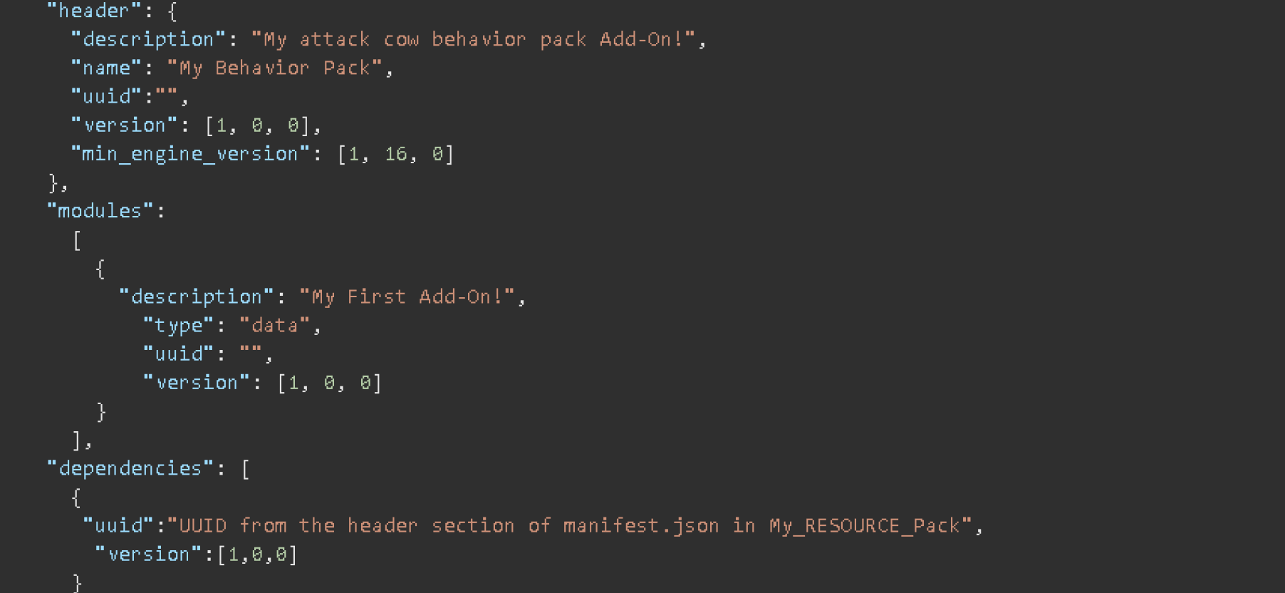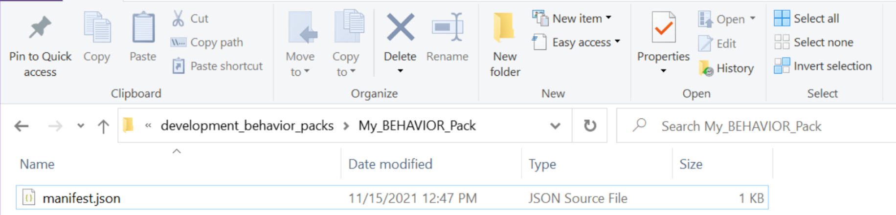 Crea un documento nuevo en tu carpeta My_BEHAVIOR_Pack y llámalo manifest.json.